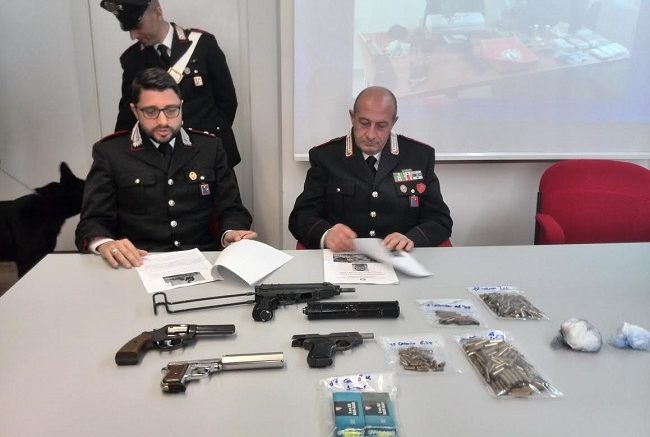 Quattro pistole e una mitraglietta con tanto di munizioni e un silenziatore, più 200 grammi di cocaina e circa 50 mila euro divisi in pacchetti confezionati sottovuoto: è il frutto della perquisizione domiciliare, effettuata ieri mattina dai carabinieri di Pescara, a carico di Ennio D’Emidio, 50enne già noto alle forze dell’ordine per detenzione di armi. L’arsenale di cui l’uomo disponeva, ben occultato nel garage della sua abitazione di un condominio a San Giovanni Teatino, in zona Dragonara, dove il 50enne vive con la sua famiglia, è stato scoperto dai carabinieri nell’ambito di una più ampia indagine, non ancora conclusa, avviata già nel mese di novembre scorso nell’intera area metropolitana.