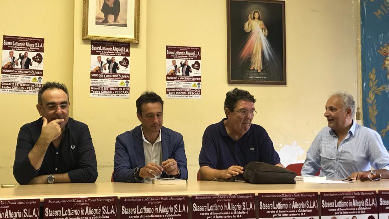 È quella che si svolgerà giovedì prossimo, 20 settembre, alle 20.30, presso il Cinema-Teatro Circus e che vedrà protagonisti due campioni della solidarietà e della comicità abruzzese, Germanio Aurelio, in arte ‘Nduccio, e Vincenzo Olivieri. Ma la protagonista sul palcoscenico sarà soprattutto Paola Mastrangelo, giornalista, docente di Lingua inglese negli Istituti Superiori che quattro anni fa ha scoperto la malattia, che le ha tolto la mobilità, ma non la sensibilità e la voglia di fare per gli altri”. Lo ha detto il Governatore della Misericordia di Pescara Berardino Fiorilli nel corso della conferenza stampa odierna convocata per presentare la serata di solidarietà ‘Stasera Lottiamo in Allegria (S.L.A.)’ che si svolgerà giovedì 20 settembre al Circus. Presenti stamane il conduttore della serata, il giornalista Rai Umberto Braccili, i due comici ‘Nduccio e Vincenzo Olivieri, Paola Mastrangelo, ed Ermanno Ricci, ex partner televisivo della Mastrangelo e oggi co-organizzatore della serata evento.