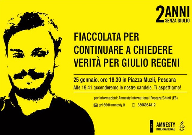 Oggi 25 gennaio, dalle ore 18.30 in Piazza Muzii, Pescara si svolge, in contemporanea con tantissime altre città italiane, la fiaccolata di Amnesty International per continuare a chiedere “Verità per Giulio Regeni”.