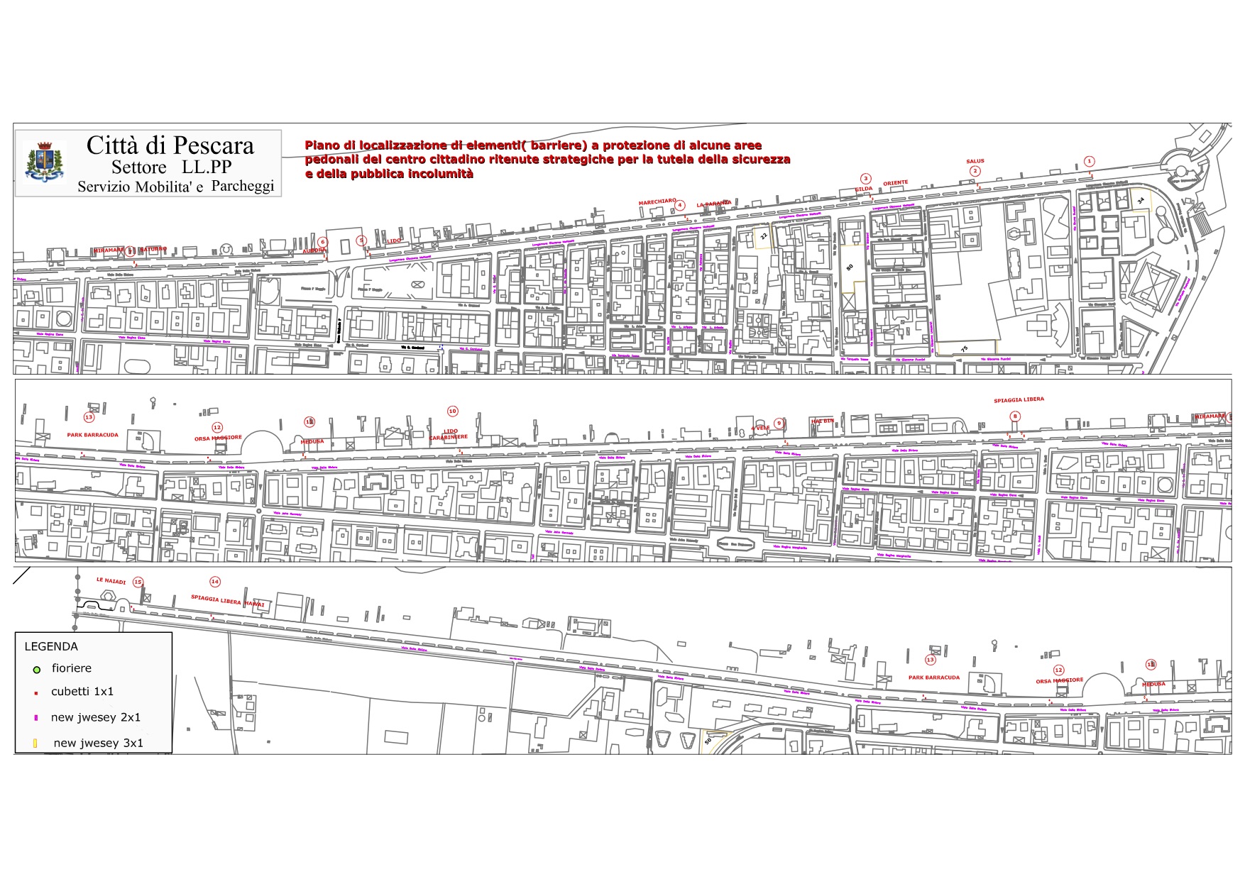 Una volta finita questa sistemazione, si procederà anche a rafforzare le barriere all’interno del quadrilatero del centro compreso fra Corso Vittorio, via Trieste, via Carducci, via Regina Elena. Su Corso Umberto e via Firenze saranno collocate fioriere grandi per limitare il transito. Sulle restanti parallele verranno invece sistemate barriere in cemento di più piccole dimensioni, colorate per essere maggiormente visibili, e comunque in grado di consentire il transito ai mezzi di soccorso e autorizzati. Questo accadrà su Piazza Muzii, sui due ingressi, via Quarto dei Mille, via Mazzini, via Piave, via Trento, via Roma, via Milano, via Firenze, angolo via Genova e via Trento. Definita questa fase di intervento si opererà anche a Pescara Vecchia, per mettere in sicurezza il tridente del centro storico, altro luogo di aggregazione.