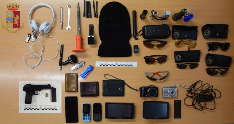 Con la perquisizione domiciliare gli è stata sequestrata varia refurtiva (alcune decine di occhiali da sole di marca, telefoni cellulari, navigatori satellitari, macchine fotografiche, chiavette usb, portafogli, probabili proventi di furti su autovetture), nonché diversi arnesi atti allo scasso (scalpelli in acciaio, 6 antenne di apparecchi jammer, coltelli multiuso, 1 passamontagna nero, 1 spinotto inibitore di batteria auto). Sono pertanto scattati gli arresti per concorso in tentata rapina aggravata, porto abusivo di arma da fuoco e ricettazione, nonché per resistenza aggravata a pubblico ufficiale. Il complice, H.A. di 31 anni, pluripregiudicato cittadino albanese irregolare sul territorio nazionale, è stato denunciato in concorso per i medesimi reati.