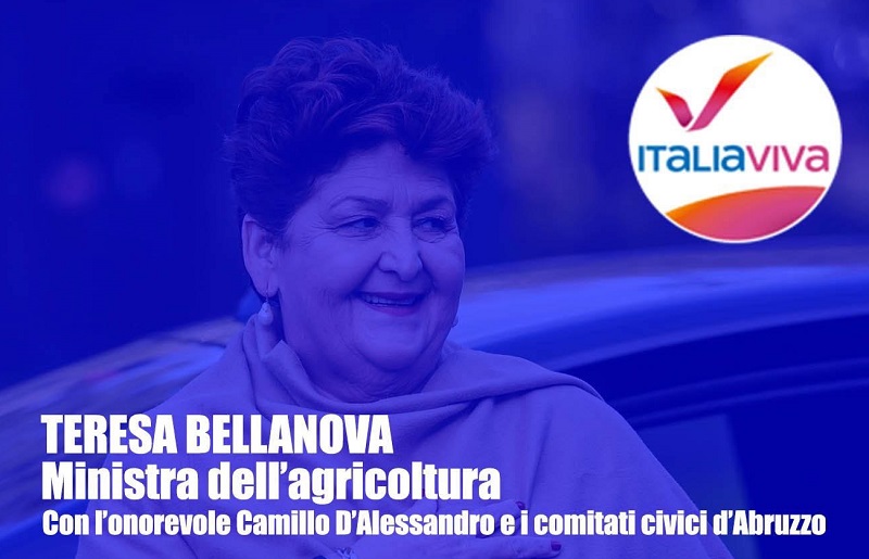 La Bellanova sarà oggi 4 novembre in Abruzzo per partecipare all’iniziativa pubblica promossa dal deputato Camillo D’Alessandro a Chieti, presso l’auditorium “Cianfarani” al Museo della Civitella, a partire dalle 17,30. Sarà la prima uscita ufficiale in Abruzzo del partito “Italia Viva” fondato da Matteo Renzi con la scissione dal PD.