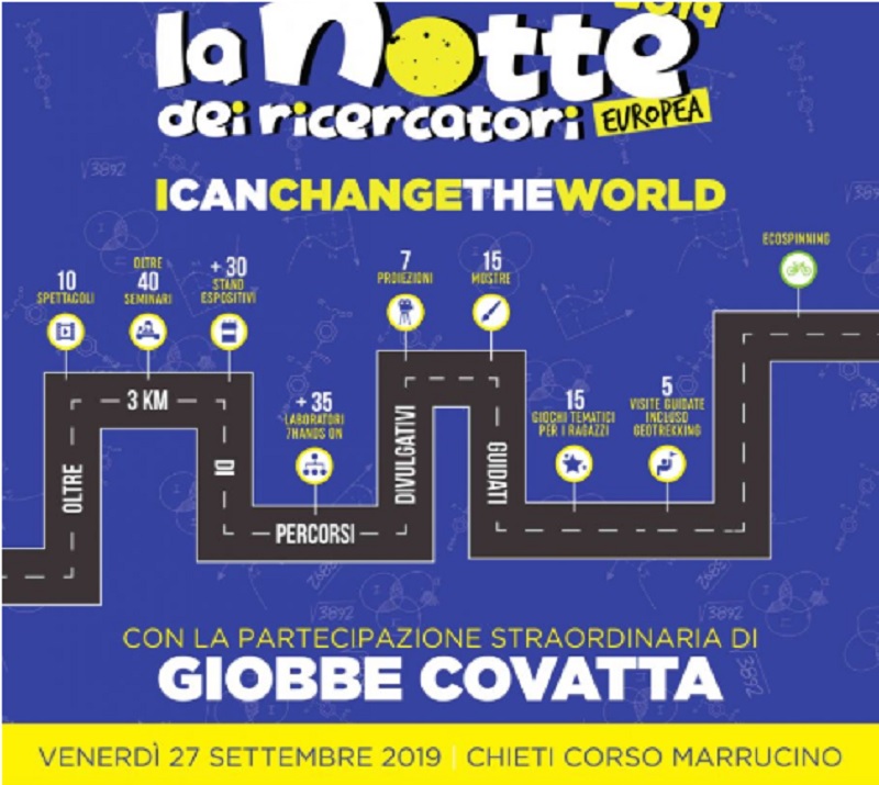 “La Notte Europea dei Ricercatori”, organizzata dall’Università degli Studi “G. d’Annunzio” di Chieti-Pescara, occuperà con i suoi 180 eventi il centro storico di Chieti, da Piazza San Giustino ai Poli museali della Villa e della Civitella passando per corso Marrucino, piazza Trento e Trieste, via IV novembre e Villa Comunale, oltre ai principali palazzi, dal Museo Barbella al Teatro Marrucino, a Palazzo de Mayo, alla sede storica della Camera di Commercio al Liceo G.B. Vico fino al Museo Universitario di piazza Trento e Trieste. L’evento inizierà alle ore 15 e proseguirà fino a notte inoltrata.