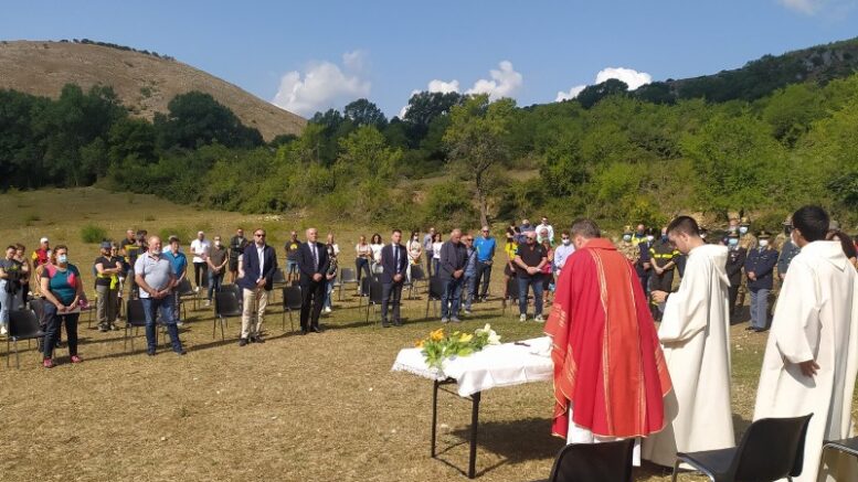 Sullo sfondo il monte Velino, nel piazzale del rifugio Casale da Monte, “una messa per la vita”, ha ricordato don Adriano Principe, all’inizio dell’omelia religiosa, davanti ad alcune decine di persone, famiglie, amministratori, rappresentanti della macchina dei soccorsi, forze dell’ordine e volontari, “per tutti quelli che vanno in montagna e per la sicurezza”.