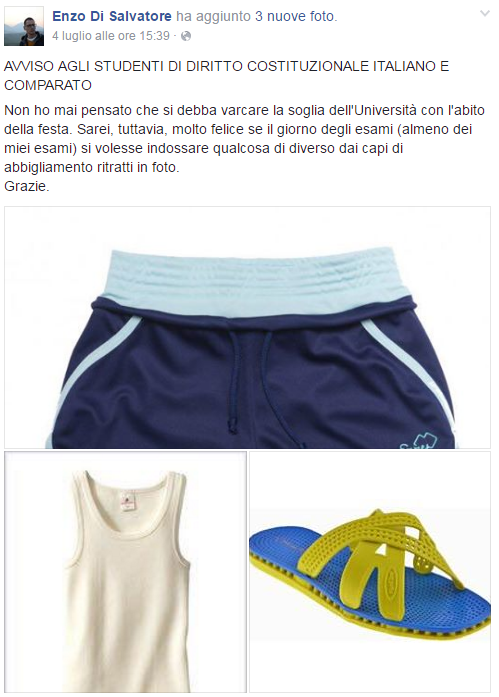 Annuncio su Facebook del professor Enzo Di Salvatore dell’Università di Teramo. Il costituzionalista No-Triv consiglia agli studenti di presentarsi agli esami vestiti in modo decoroso