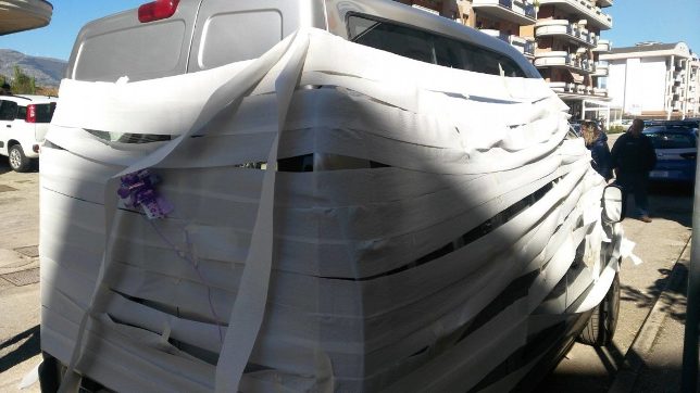 Oltre alla carta igienica c’era anche un fiocco appeso sia nella parte anteriore che posteriore del veicolo, parcheggiato in strada. Vittima dell’episodio una disabile di Sulmona, residente in via San Polo, che ha avvisato le forze dell’ordine. Sul posto la Polizia Scientifica per eseguire i rilievi: le indagini sono svolte dal commissariato. Pure non essendoci danni al veicolo furgonato, la madre della disabile ha presentato una denuncia contro ignoti per danno all’immagine.
