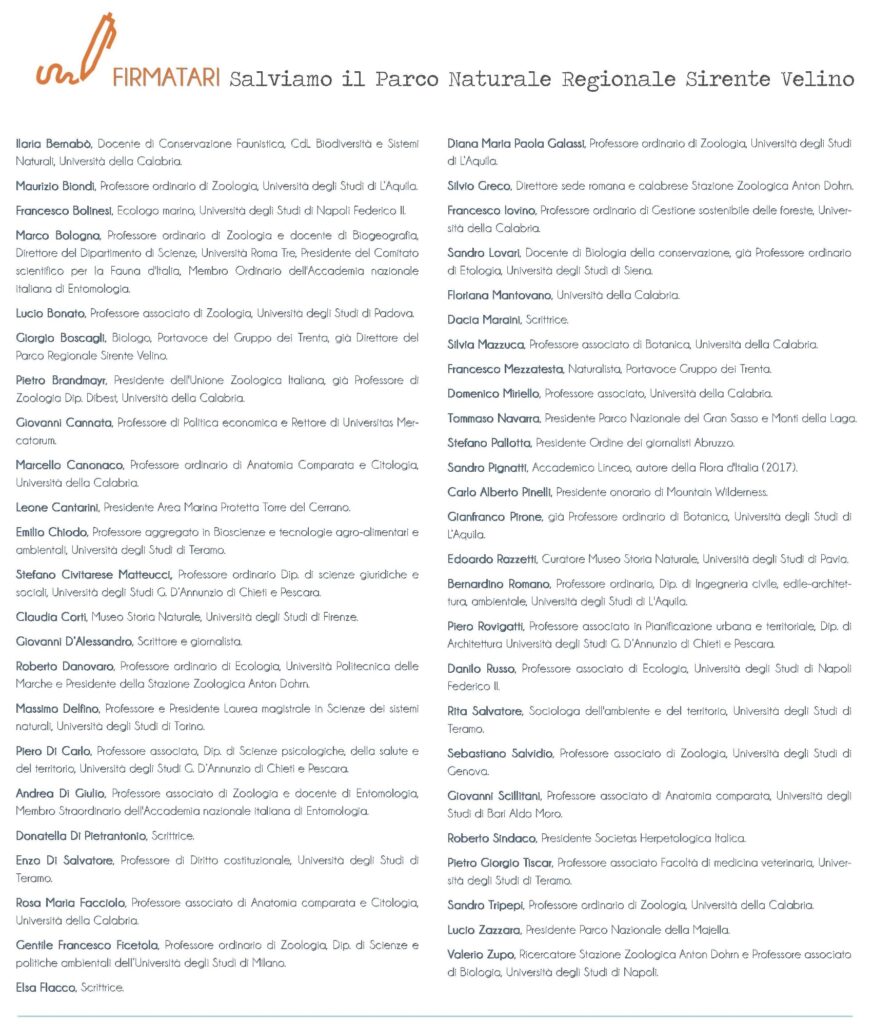 I firmatari sono persone di spicco nel mondo della scienza e della cultura. C’è chi vanta una ormai pluridecennale attività in prima linea per la protezione della natura, come Fulco Pratesi, presidente onorario dell’Associazione del Panda e primo sottoscrittore dell’appello; chi si occupa dello studio del territorio, spesso proprio nella nostra Regione; chi racconta l’Abruzzo attraverso la cronaca giornalistica o i romanzi… Ci sono, insomma, professori e rettori universitari, ricercatori, giornalisti, scrittori, presidenti di aree protette… personalità accademiche e del mondo della cultura nazionale e abruzzese tra le più note, che fanno sentire la propria voce per il Sirente Velino.