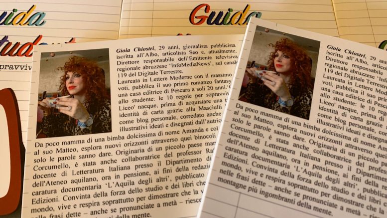 Pensato come un sogno, nato come un blog e, ora, edito dalla Masciulli Edizioni di Pescara, nelle sembianze di un progetto di carta itinerante, con il fine di divulgare, di scuola in scuola, le 10 regole d’oro per sopravvivere al Liceo. Ha tagliato il traguardo della pubblicazione il diario-romanzo “Guida allo studente – 10 regole per sopravvivere al Liceo”, firmato dalla giornalista abruzzese Gioia Chiostri, volto di TV dell’Emittente regionale “Info Media News”, al canale 119 del Digitale Terrestre. Il libro si rivolge ad un pubblico giovane e meno giovane, cucendosi addosso l’obiettivo di scardinare le serrature-tabù rimaste ancora chiuse a chiave, sugli anni che si trascorrono al Liceo o in qualsiasi altro Istituto di scuola superiore.