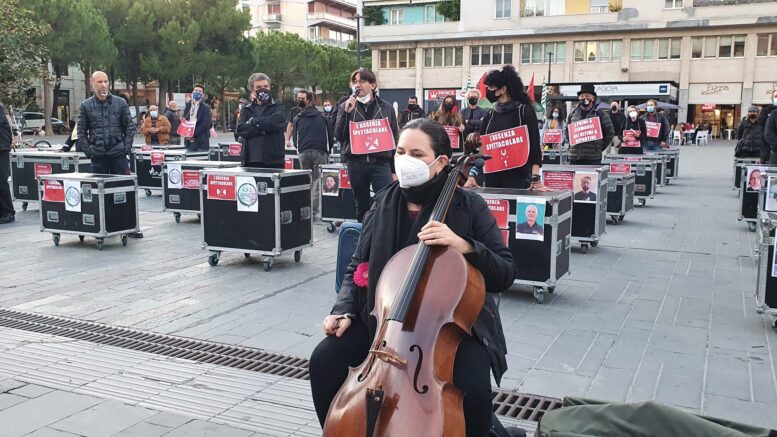 Abiti neri come il momento che vivono. Un fiore rosso come la speranza che sperano di non perdere del tutto. Così, oggi, in piazza Salotto a Pescara gli addetti di arte e cultura. Altra categoria fortemente penalizzata dalle ultime restrizioni del Dpcm di domenica scorsa. Arte e cultura i cui operatori avevano già dovuto sopportare i mesi del lockdown e subito dopo la faticosissima, mai completa, ripresa delle attività. Non ce la dimenticheremo mai un’estate, come la scorsa, senza concerti in stadi e piazze.