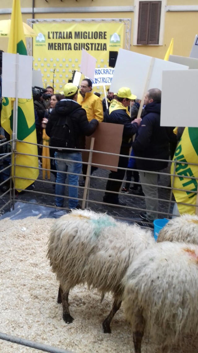 Secondo l’agenzia Ansa sono centinaia gli agricoltori e gli allevatori della Coldiretti giunti dalle aree terremotate di Marche, Abruzzo, Umbria e Lazio a Roma davanti Piazza Montecitorio, dove pascolano anche alcune pecore sopravvissute dalle stalle crollate. Alla manifestazione sono presenti anche i sindaci dei Comuni colpiti, riconoscibili dalle insegne delle diverse delegazioni. Nei cartelli esposti dagli agricoltori si legge: “Ho perso gli animali, non la dignità”; “Meno chiacchiere più stalle”; “A.A.A. Cercasi normalità”. Gli striscioni della Coldiretti recitano “La burocrazia uccide più del terremoto” e “L’Italia migliore merita giustizia”. In piazza troneggia anche un grande tavolo apparecchiato con i prodotti locali salvati dalle macerie, dalle lenticchie di Castelluccio al ciauscolo, dal pecorino Amatriciano a quello di Farindola e molto altro, prodotti che rischiano di sparire per le difficoltà del mercato locale, per la crisi del turismo, l’esodo forzato, i ritardi nella costruzione degli alloggi temporanei. In piazza Montecitorio è tutto pronto anche per la proiezione del filmato-denuncia #stalletradite, sui gravi ritardi della ricostruzione nelle aree rurali, dove si sommano inefficienze, incompetenze e furberie. E’ presente anche il presidente nazionale della Coldiretti Roberto Moncalvo, per incontrare il presidente del Senato Piero Grasso, mentre la Presidente della Camera Laura Boldrini ha dovuto annullare l’incontro dopo essere stata operata d’urgenza.