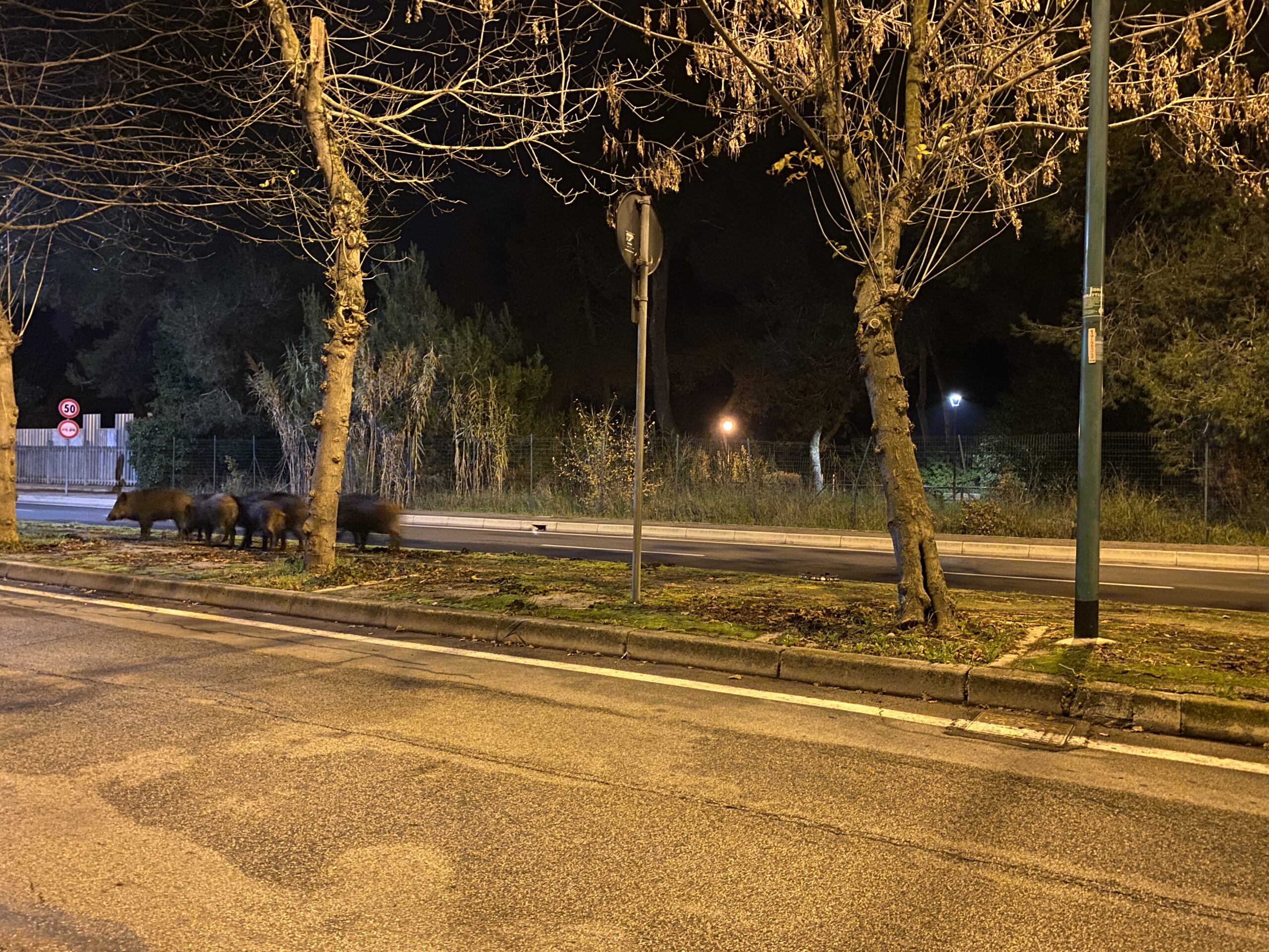 In questa foto inviataci da un lettore del nostro sito si contano cinque forse sei cinghiali adulti a caccia di cibo su un marciapiede in via della Bonifica, ossia alle spalle della Pineta dannunziana. Che i cinghiali ormai siano in circolazione anche in tante città è cosa ben nota: basti pensare ai tanti video girati in quartieri nemmeno tanto periferici di Roma. Il punto è che in quella zona di Pescara, dove sono stati avvistati la notte scorsa, negli ultimi anni è aumentata di molto la residenzialità quindi avrebbero potuto incappare nel branco di cinghiali i padroni di cani spesso a passeggio anche a notte inoltrata per l’ultima pipì del nostro amico a quattro zampe.