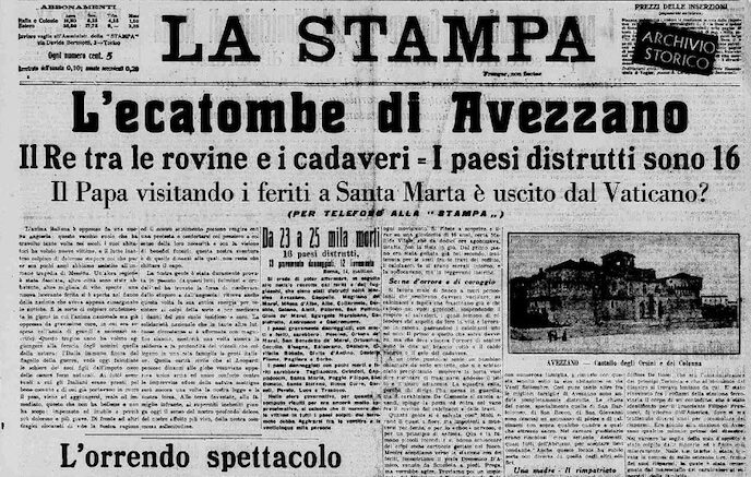 Il terremoto di Avezzano del 1915 ebbe effetti distruttivi in tutta la Marsica: 21 località subirono la distruzione quasi totale degli edifici, con intensità macrosismiche maggiori o uguali al X grado MCS. Particolarmente pesante fu anche il numero totale delle vittime pari a circa 30.000 persone. La Marsica, punteggiata di centri abitati e intensamente popolata, nel giro di pochi minuti è rasa al suolo. Il numero delle vittime è indicibile. Ad Avezzano, una delle città più colpite, sono meno di mille i superstiti su oltre 11mila abitanti. Enormi perdite si registrano anche a Collarmele, San Benedetto dei Marsi, Paterno, Ortucchio, Gioia dei Marsi e in tutte le altre località della Piana e della Valle del Liri. Complessivamente, oltre 30mila persone restano uccise. Ed è uno scenario di guerra che si trovano a raccontare gli “inviati” dell’epoca, le cui cronache riportano immagini di feriti, macerie, disperazione.