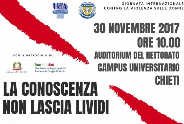 L’iniziativa, che ha per titolo “La conoscenza non lascia lividi”, è stata promossa dall’Ud’A in occasione della Giornata internazionale contro la violenza sulle donne. L’appuntamento è a partire dalle ore 10, nell’auditorium del Rettorato dell’Ud’A, a Chieti. Ad aprire i lavori é il sottosegretario di Stato alla Giustizia, Federica Chiavaroli, mentre il vicepresidente del Csm Giovanni Legnini chiude l’incontro. Tra i relatori figura anche Lucia Annibali, l’avvocatessa marchigiana sfregiata al volto con l’acido solforico lanciato da un uomo ingaggiato dall’ex fidanzato. La Annibali, componente del dipartimento delle Pari opportunità della presidenza del Consiglio dei ministri, racconta la propria drammatica esperienza. I lavori si aprono con gli interventi del rettore Sergio Caputi, del sindaco Umberto Di Primio e del presidente della Regione Luciano D’Alfonso. Intervengono anche Patrizia Salmoiraghi, presidente Soroptimist international Italia, che si sofferma sulla possibilità di ricominciare attraverso il progetto “Si sostiene”; Francesca Cermignani, presidente Cug dell’ateneo d’Annunzio, sul tema “Parità e rispetto nella vita quotidiana”. Il convegno è patrocinato dal ministero della Giustizia.