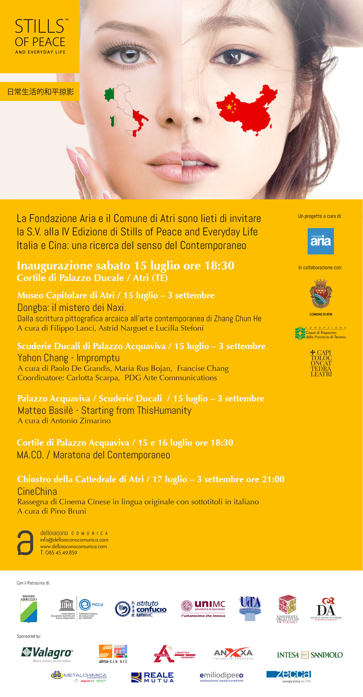 Il programma delle mostre e degli eventi previsti per la IV Edizione di Stills of Peace and Everyday Life/Italia e Cina prenderà il via sabato 15 luglio alle ore 18.30, presso il cortile di Palazzo Acquaviva, nell’omonima Piazza di Atri.