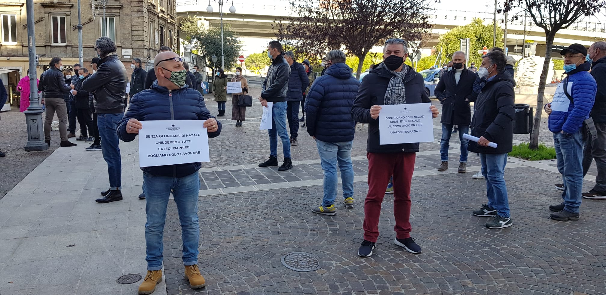 Hanno scelto piazza Unione, a Pescara, i commercianti oggi in protesta: i loro negozi ancora chiusi, nei giorni in cui avrebbe dovuto iniziare lo shopping natalizio, è un danno irreparabile. Appello al Governo.