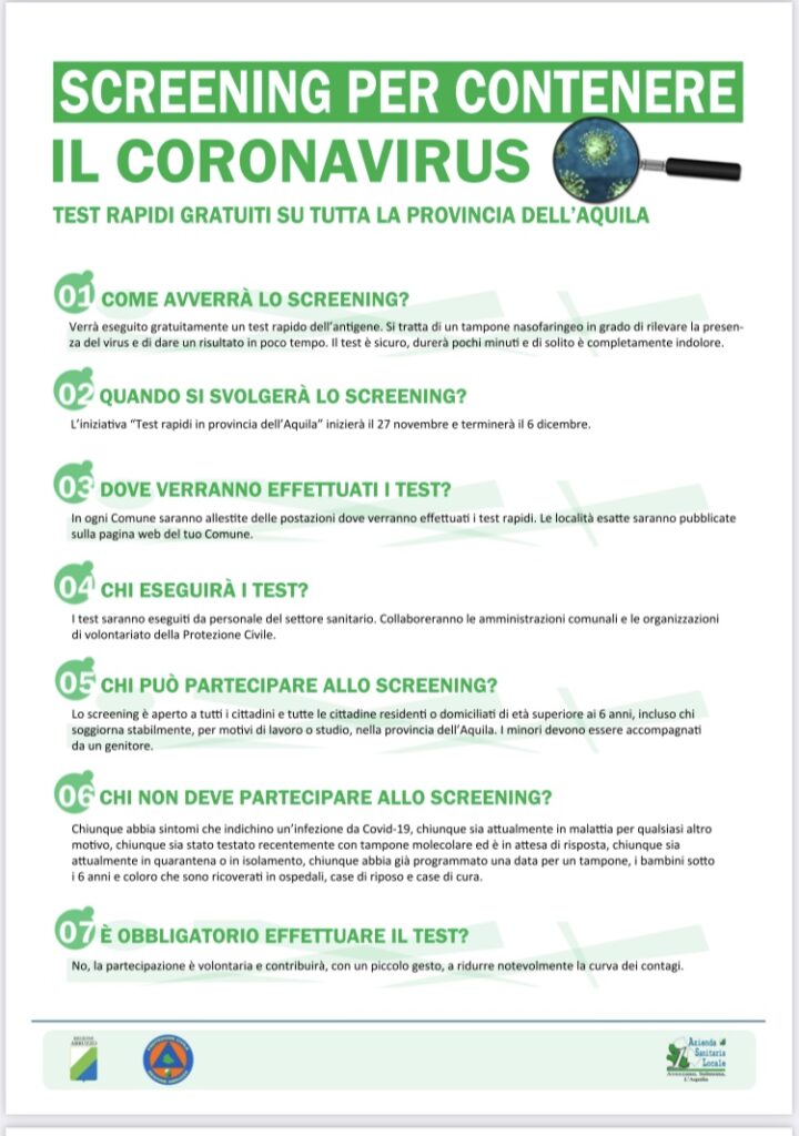 Partirà domani, 27 Novembre, lo screening di massa sulla popolazione nella provincia dell’Aquila.