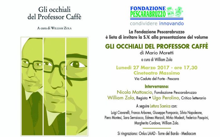 A trent’anni dalla misteriosa scomparsa di Federico Caffè, le fondazioni PescarAbruzzo e Centro di Ricerca Federico Caffè–Corradino D’Ascanio hanno ricordato l’economista pescarese curando la realizzazione del volume “Gli occhiali del Professor Caffè”, che raccoglie il testo integrale della pièce teatrale di Mario Moretti, andata in scena a Pescara nel 2004 con la regia di William Zola.