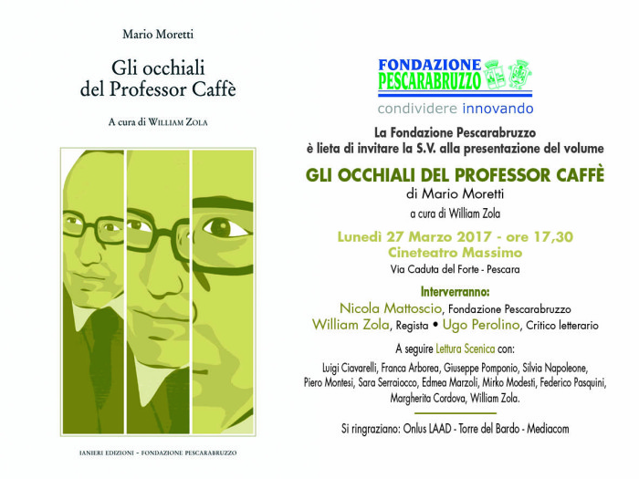 A trent’anni dalla misteriosa scomparsa di Federico Caffè, le fondazioni PescarAbruzzo e Centro di Ricerca Federico Caffè–Corradino D’Ascanio hanno ricordato l’economista pescarese curando la realizzazione del volume “Gli occhiali del Professor Caffè”, che raccoglie il testo integrale della pièce teatrale di Mario Moretti, andata in scena a Pescara nel 2004 con la regia di William Zola.