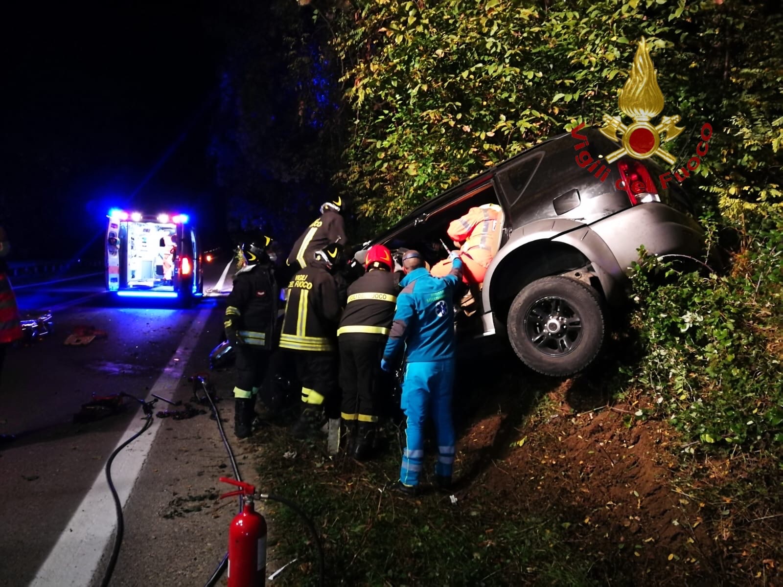 All’arrivo dei mezzi di soccorso l’auto, uscita di strada, era accartocciata in un cespuglio dopo esser finita contro il guard rail. Il conducente, un 32 enne, era incastrato nelle lamiere ed il personale Vigili del Fuoco, con attrezzature particolari, ha impiegato diversi minuti per tirare fuori dall’abitacolo la persona alla guida. Affidato al personale del 118 il conducente rimasto ferito, sul posto è giunta una pattuglia dei Carabinieri per ricostruire la dinamica dell’accaduto.