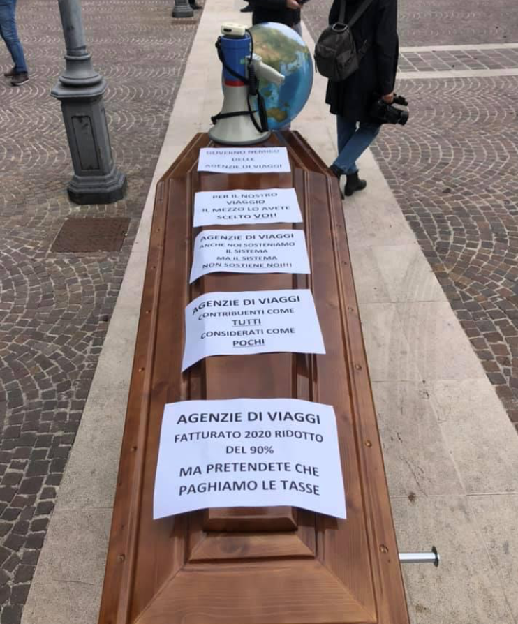 Una bara circondata da striscioni in piazza Unione, a Pescara, sotto la sede della Regione Abruzzo: è il simbolo che questa mattina hanno usato una cinquantina di titolari di agenzie di viaggio per lanciare un grido di disperazione.