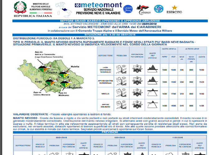 generale moderatamente consolidato, presenta croste da fusione e rigelo e da vento, portanti e non portanti, su strati intermedi moderatamente consolidati. La distribuzione della neve risulta irregolare, con alternanza di zone con grandi accumuli e pendii in cui lo spessore è scarso o nullo. Il problema comune a tutte le zone dell’appennino abruzzese è la cosiddetta neve bagnata, tuttavia il grado di pericolo, almeno per oggi, si presenta differenziato, dal marcato del Gran Sasso Laga-Terminillo al moderato della Majella. Domani e dopodomani il rischio si attesterà a moderato in tutte le cime abruzzesi, dove sono previste anche precipitazioni nevose.