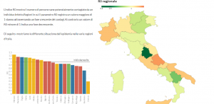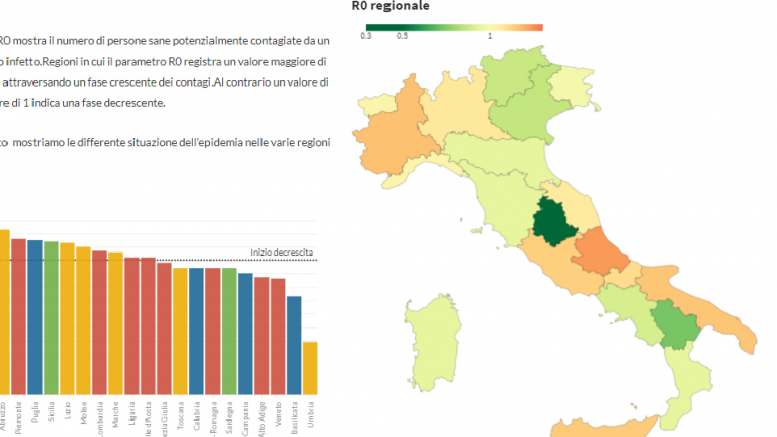 Nel grafico viene mostrato l’andamento dell’indice dal momento in cui si è raggiunto un numero significativo d’infetti su cui poterlo calcolare. L’indice R0 mostra il numero di persone sane potenzialmente contagiate da un individuo infetto. Regioni in cui il parametro R0 registra un valore maggiore di 1 stanno attraversando un fase crescente dei contagi. Al contrario, un valore di R0 minore di 1 indica una fase decrescente. Di seguito mostriamo le differente situazione dell’epidemia nelle varie regioni d’Italia, la grafica evidenzia la prima posizione dell’Abruzzo con un Ro di 1.23: