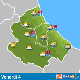 Nel teramano, brevi rovesci e schiarite. I venti saranno prevalentemente moderati e soffieranno da Nord-Ovest con intensità di 26 km/h. Possibili raffiche fino a 41 km/h. Temperature: 3°C la minima e 10°C la massima. Quota 0°C a 1100 metri.