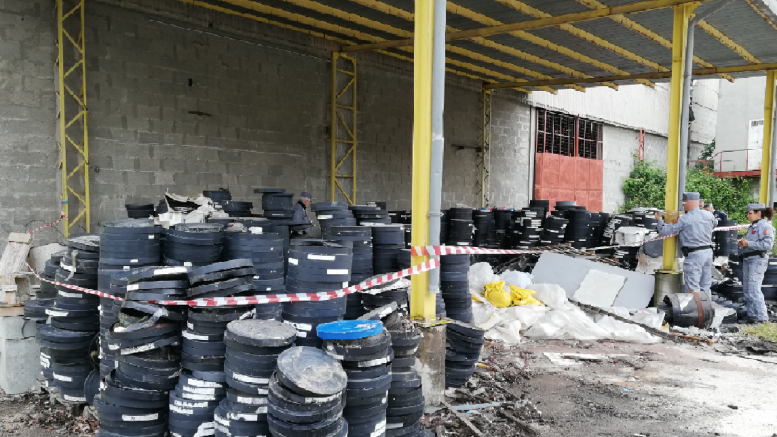 Nell’area di pertinenza esterna sono stati trovati, infatti, molti cumuli di rifiuti di diversa tipologia: inerti provenienti da demolizioni, terre da scavo, scarti vegetali e materiale legnoso, lastre di eternit coperte da un telo di plastifica nero, materiale edile, blocchi di calcestruzzo. All’interno del capannone, liberamente accessibile, è stata rinvenuta della polvere di vernice di vario colore oltre a tramezzature in calcestruzzo armato demolite.