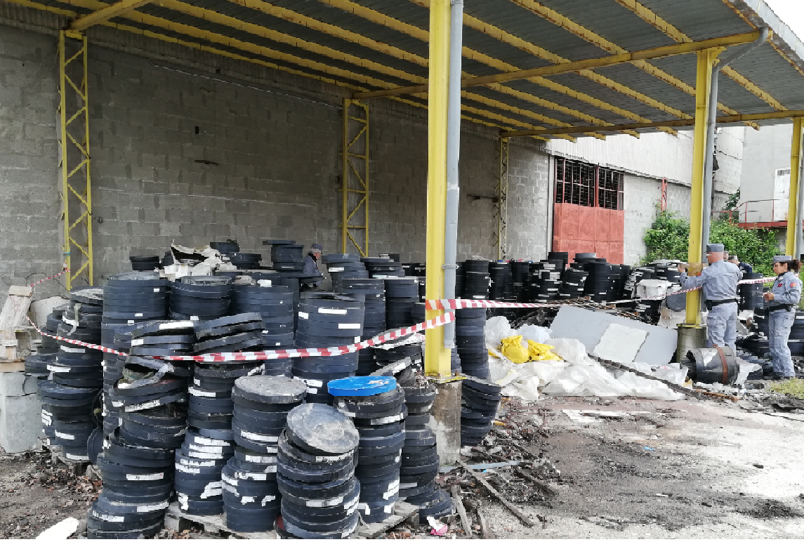 Nell’area di pertinenza esterna sono stati trovati, infatti, molti cumuli di rifiuti di diversa tipologia: inerti provenienti da demolizioni, terre da scavo, scarti vegetali e materiale legnoso, lastre di eternit coperte da un telo di plastifica nero, materiale edile, blocchi di calcestruzzo. All’interno del capannone, liberamente accessibile, è stata rinvenuta della polvere di vernice di vario colore oltre a tramezzature in calcestruzzo armato demolite.