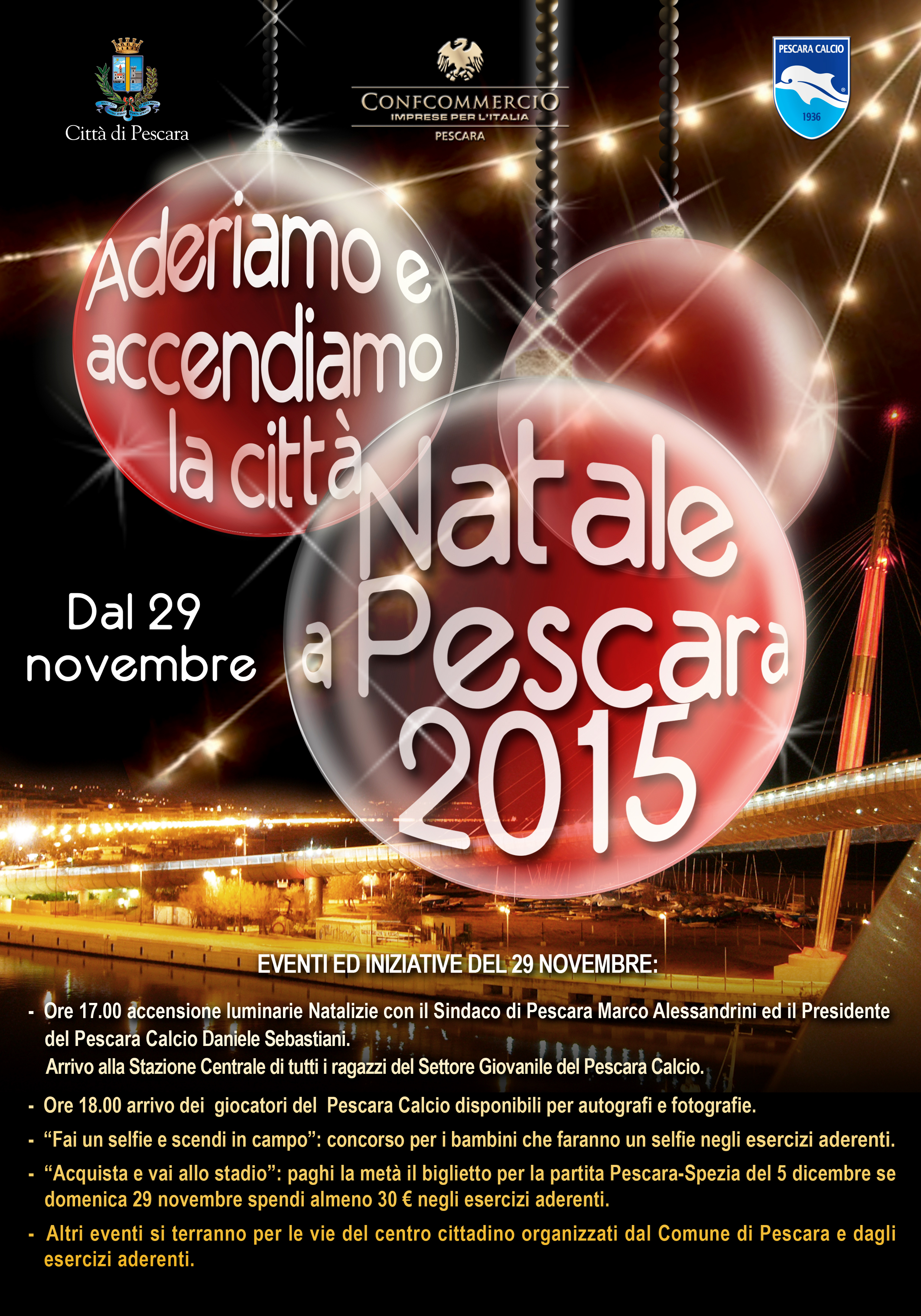 E’ tutto pronto a Pescara per il lungo pomeriggio di intrattenimento e divertimento in centro città: alle 17 in punto verranno accese le luminarie natalizie per le vie del cuore cittadino e Pescara comincerà a respirare il clima delle feste. All’incrocio fra Corso Umberto e via Firenze/via C. Battisti si sarà l’accensione contemporanea delle luminarie alla presenza del Sindaco di Pescara, Marco Alessandrini, e del Presidente della Pescara Calcio, Daniele Sebastiani. Mezzora prima, alle 16,30, partiranno dalla stazione di Pescara Porta Nuova e arriveranno in treno alla Stazione Centrale di Pescara circa trecento ragazzi del Settore Giovanile della Pescara Calcio. Mentre loro sfileranno lungo le vie del centro, già ‘illuminate’ dal Natale 2015, intorno alle 18 arriveranno i giocatori della Pescara Calcio che si intratterranno per autografi e fotografie con passanti e tifosi. Per l’intero pomeriggio, inoltre, sarà possibile partecipare al concorso riservato ai bambini ‘Fai un selfie e scendi in campo’: in base al gradimento ricevuto da uno speciale ‘Facebook voto’saranno scelti i bambini che accompagneranno in campo i giocatori in occasione di una prossima partita interna del Pescara. Peraltro chiunque effettui un’acquisto minimo di 30€, documentato da scontrino, presso i negozi aderenti all’iniziativa avrà diritto ad uno sconto del 50% sull’acquisto del biglietto per la partita Pescara-Spezia in programma il 5 dicembre. Infine, grazie ad un accordo con Trenitalia tutti coloro che da oggi raggiungeranno Pescara utilizzando i treni regionali potranno usufruire, dietro presentazione del biglietto ferroviario, di uno sconto minimo del 10% sugli acquisti effettuati nelle attività aderenti all’iniziativa.