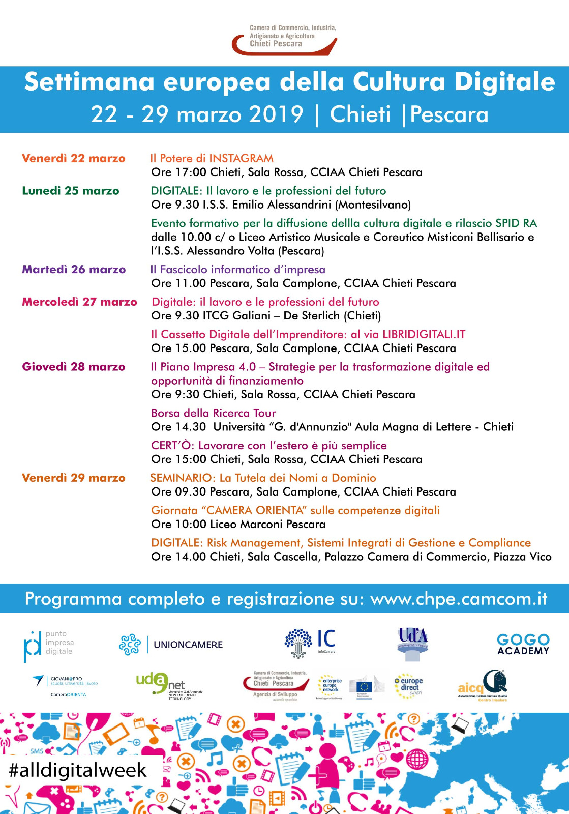 Partono oggi, con l’approfondimento dedicato ad Instagram, gli appuntamenti della Camera di Commercio Chieti Pescara organizzati nell’ambito della Settimana europea della cultura digitale. L’ente camerale ha deciso di aderire con un programma coordinato dal PID (Punto di Impresa Digitale) che prevede 12 eventi tra Chieti e Pescara. I destinatari delle iniziative messe in campo dalla Camera di Commercio Chieti Pescara e dall’Agenzia di Sviluppo sono le imprese, i professionisti e gli studenti interessati dalle novità che stanno cambiando radicalmente il modo di lavorare.