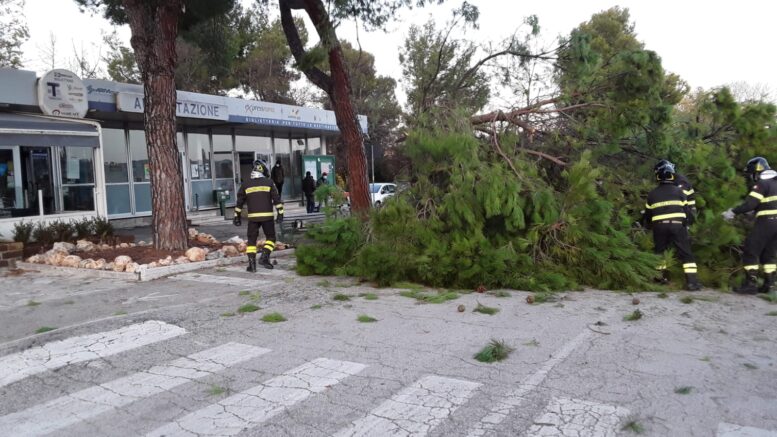 Nel pomeriggio di oggi, intorno alle 16:00, una squadra del Comando dei Vigili del Fuoco di Teramo è intervenuta a Teramo, a seguito della caduta di un grosso albero, uno dei quattro pini marittimi presenti nel piazzale a ridosso della stazione dei pullman. L’albero è rovinato fragorosamente sull’asfalto dopo essersi troncato alla base. Fortunatamente non è caduto verso l’autostazione, ma verso il piazzale, dove, in quel momento, non transitavano auto o persone e pertanto non ha provocato danni di alcun genere. I vigili del fuoco, allertati dal gestore del bar, sono arrivati immediatamente sul posto e hanno ispezionato con attenzione la zona coperta dalla folta chioma dell’albero, alto oltre venti metri e con un tronco di oltre un metro di diametro. Sul posto sono intervenuti gli assessori comunali Di Bonaventura e Verna, l’agronomo del comune, la Polizia di Stato e la Polizia Locale di Teramo. La rimozione del pino è stata affidata a una ditta incaricata dal comune di Teramo.