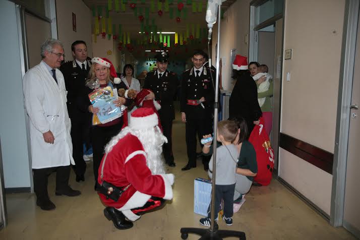 Anche quest’anno l’Adricesta di Carla Panzino ha portato sorrisi e doni ai piccoli pazienti dei reparti pediatrici dell’ospedale di Pescara: il sacco pieno di giocattoli in spalla, per il 13 esimo anno consecutivo, ad un Babbo Natale come dire…particolare. Sotto barba e pancione rosso un carabiniere del Comando provinciale pescarese: eh già, anche quest’anno il Babbo Natale in corsia è stato quello dei carabinieri comandati dal Colonnello Piccinelli divertito lui per primo. Una iniziativa Adricesta Onlus capitanata dalla instancabile Carla Panzino commossa, insieme alle sue tante volontarie, nel vedere quei piccoli visi impauriti e doloranti per la malattia che li costringe in ospedale, anche in questi giorni di festa, ritrovare la spensieratezza di bambini. A ringraziare Adricesta e carabinieri il professor Pierluigi Lelli Chiesa responsabile dell’Unità Operativa di Chirurgia Pediatrica dell’Ospedale Civile ‘Spirito Santo’ di Pescara: ‘ Nessuno meglio di noi sa cosa vuol dire un sorriso per questi bimbi affidati alle nostre cure’. Colonna sonora della allegra mattinata affidata ai laureandi del corso di Musicoterapia del Conservatorio di Pescara.