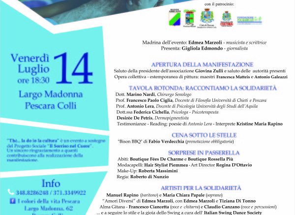 Si comincia alle ore 18.30 con i saluti della presidente Giovina Zulli e delle autorità presenti e proseguirà con una tavola rotonda dal titolo “Raccontiamo la solidarietà” che vedrà come ospiti il dott. Marino Nardi, chirurgo senologo dell’Ospedale Civile di Pescara; il prof. Francesco Paolo Ciglia, docente di filosofia all’Università di Chieti e Pescara; il prof. Antonio Lera, docente di psicologia all’Università degli Studi dell’Aquila; la dott.ssa Federica Cicchella, psicologa e psicoterapeuta; Desirée De Petris, dermopigmentista. Seguiranno testimonianze e reading con poesie di Antonio Lera interpretate da Kristine Maria Rapino. E’ prevista, inoltre, una cena sotto le stelle a cura di “Bison BBQ” di Fabio Verdecchia, con prenotazione obbligatoria.