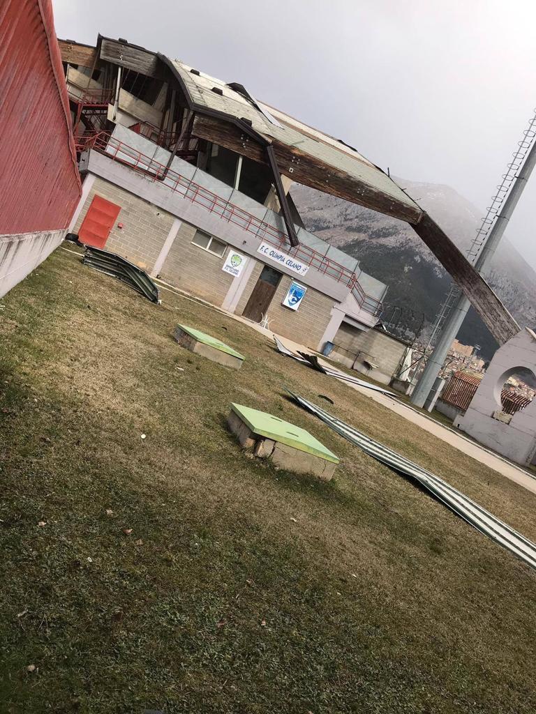 Anche il tetto dello stadio di Celano non ha retto alle fortissime raffiche di vento che stanno letteralmente spazzando l’Abruzzo da ore ed ore.