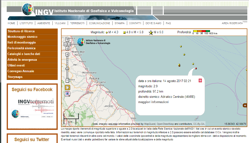 Qualcuno afferma di averla sentita, pure se la scossa stavolta è avvenuta nelle abissali profondità marine, altri sono solo preoccupati: di certo c’è che, in una regione come l’Abruzzo, l’attenzione per gli eventi sismici resta alta. Non c’è solo l’area al confine tra Abruzzo, Lazio e Umbria: il territorio è interessato da un’attività sismica di una certa intensità anche nel mare Adriatico centrale, in particolare al largo della costa al confine tra Abruzzo e Molise, come anche in Croazia. L’ultimo evento sismico registrato dall’Istituto Nazionale di Geofisica e Vulcanologia risale alla notte di ferragosto. Alle 2.21 i sismografi hanno segnato una scossa di 2.9 di magnitudo. L’area è poco distante da quella dove, il 5 agosto, era stata registrata una scossa di magnitudo 2.4, avvenuta molto più in superficie, a 10 chilometri di profondità.