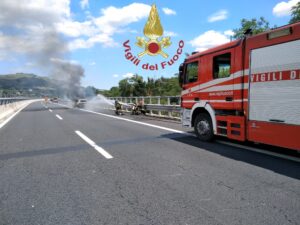 Un incendio ha quasi distrutto autovettura, alimentata a Gpl, che stava transitando, oggi, sull’autostrada A/25 tra Scafa e Torre de Passeri.