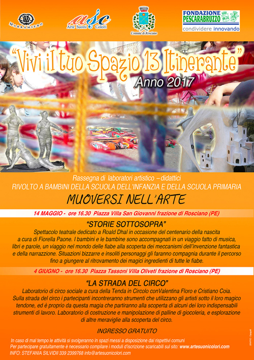 In una nota si legge che “Grazie al sostegno della Fondazione Pescarabruzzo, dell’Azienda vinicola Marramiero e del Comune di Rosciano che hanno dimostrato sensibilità anche nelle edizioni precedenti, sarà possibile per i partecipanti scoprire diversi linguaggi espressivi, permettendo loro di farne un’esperienza creativa e allo stesso tempo ludica. Quest’anno il Comune coinvolto sarà Rosciano in due delle sue frazioni: Villa San Giovanni e Villa Oliveti. In una delle due giornate creative, il 14 maggio alle ore 16.30 nella piazza di Villa San Giovanni, si svolgerà uno spettacolo a cura di Fiorella Paone, dedicato a Roald Dhal (in occasione del centenario della nascita).I bambini e le bambine saranno accompagnati in un viaggio fatto di musica, libri e parole, un viaggio nel mondo della fiaba alla scoperta dei meccanismi dell’invenzione fantastica e della narrazione. Situazioni bizzarre e insoliti personaggi gli faranno compagnia durante il percorso fino a giungere al ritrovamento dei magici ingredienti di tutte le fiabe.Successivamente si svolgerà un laboratorio creativo collegato allo spettacolo teatrale a cura di Stefania Silvidii. Altro evento, il 4 giugno sempre alle 16.30, nella piazza di Villa Oliveti, ci sarà un’animazione di circo sociale a cura della Tenda in Circolo con Valentina Floro e Cristiano Coia, dove i partecipanti incontreranno strumenti che utilizzano gli artisti sotto il loro magico tendone, ed è proprio da questa magia che partiranno alla scoperta di alcuni dei loro indispensabili strumenti di lavoro. Inoltre sarà realizzato un laboratorio di costruzione e manipolazione di palline di giocoleria e esplorazione di altre meraviglie alla scoperta del circo.“Vivi il tuo Spazio” è un’iniziativa che si pone l’obiettivo di sensibilizzare ai svariati linguaggi espressivi dell’Arte, con caratteristiche educative artistiche, ludiche, culturali e di aggregazione sociale, rivolta soprattutto a bambini e adolescenti. L’idea di promuovere e divulgare i codici artistici attraverso l’organizzazione di eventi e attività formative a favore dei bambini nacque nel lontano 2003, quando l’associazione culturale di volontariato “ASC Arte Suoni Colori”decise di promuoversi all’interno dei piccoli centri, prima dell’hinterland pescarese poi dell’intera regione, con la volontà precisa di dotare queste realtà di un’offerta culturale sperimentale, innovativa e di qualità. Un progetto di certo ambizioso ma che scaturisce dalla convinzione che le nuove generazioni non debbano restare ai margini della società ma essere le vere protagoniste di ogni azione che le riguarda. Inoltre come ogni estate ASC organizzerà i Campus Creativi ricchi di stimoli nuovi e molto innovativi per il territorio. Le attività ludiche e didattiche si terranno nell’ampio spazio del Centro Esploratorio a Villa Oliveti Rosciano, gestite da professionisti con pluriennale esperienza didattica e pedagogica e da artisti professionisti delle varie discipline. Verranno allestiti laboratori di pittura fantastica, di disegno, di riclarte, di manipolazione e lavorazione dell’argilla e decorazione di manufatti secondo le tecniche della ceramica. I giovani potranno giocare con l’arte, addentrandosi in un mondo di creatività, fantasia. Tutti i lunedì , martedì, mercoledì, giovedì,venerdì rispettivamente laboratorio di arti visive a cura di Stefania Silvidii, laboratorio di pedagogia musicale a cura di Rogerio Celestino, laboratorio di lettura animata a cura di Fiorella Paone e Rosy Scurria, laboratorio di circo a cura di Valentina Floro e Cristiano Coia e laboratorio di yoga a cura di Vanesa Tesone. I laboratori sono rivolti a bambini dai 3 ai 12 anni e attraverso il laboratorio di pedagogia musicale sarà possibile imparare a coordinare i propri movimenti, a esprimersi attraverso il corpo, sviluppare le capacità di ascolto e imparare a percepire e discriminare i fenomeni sonori interagendo con l’universo sonoro e coordinando la propria azione con quella degli altri, sviluppando l’intelligenza musicale. L’animazione del libro sarà per i partecipanti un’ occasione per vivere il libro, come un oggetto da toccare, sfogliare, guardare esplorare, raccontare insieme, diventando tramite di vicinanza, di attenzione e di affetto.Con il laboratorio di circo i bimbi si avvicineranno alle arti circensi attraverso il movimento, l’equilibrio, la giocoleria,l’espressività della clowneria.Inoltre si praticheranno esercizi di riscaldamento corporeo e yoga, per imparare la concentrazione, il rilassamento e la percezione del proprio corpo e delle proprie potenzialità espressive e creative Info: tel. 3392399768 info@artesuonicolori.com www.artesuonicolori.com”.