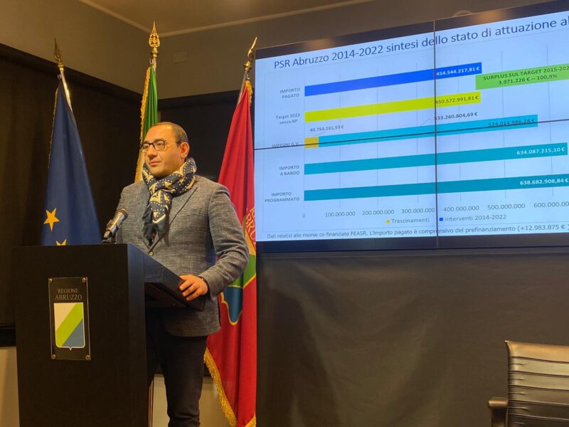 Il vice presidente della Regione con delega all’agricoltura Emanuele Imprudente, assieme all’autorita’ di gestione del Psr Abruzzo Elena Sico, direttore del dipartimento agricoltura, ha presentato i dati relativi all’andamento della spesa al 31 dicembre 2023 in relazione ai fondi europei del programma di sviluppo rurale 2014 – 2022, del complemento per lo sviluppo rurale 2023 – 2027, del fondo per lo sviluppo e la coesione, del Pnrr, dei finanziamenti erogati nell’ambito dell’organizzazione comune dei mercati e del fondo europeo affari marittimi pesca e agricoltura.