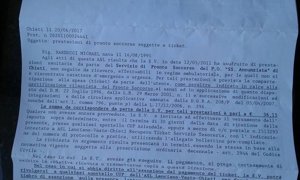 Michael Narducci aveva 16 anni quando nel maggio del 2011, a seguito di un incidente con il motorino, fu costretto a ricorrere alle cure del Pronto Soccorso del SS Annunziata di Chieti, gli fu consigliato il ricovero ma lui preferì tornare a casa. Dopo poco più di due anni a causa di un altro incidente, purtroppo questa volta più grave, Michael perse la vita lasciando nel dolore i suoi genitori. Ma la burocrazia, nel suo lento e pachidermico incedere, non guarda in faccia a nessuno e poco importa a chi rivolge le sue pretese. E’ così che, a distanza di 6 anni, e sottolineiamo 6 anni, da quella prestazione in Pronto Soccorso, la madre del povero Michael si vede recapitare la lettera della Asl di Lanciano-Vasto-Chieti, indirizzata a suo figlio, con tanto di bollettino di 36,15 euro da pagare, riscoprendo un dolore lancinante che con grande fatica sta provando a combattere: