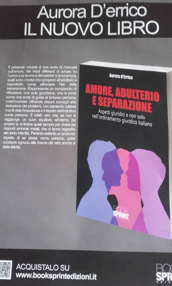 Si tratta di un saggio sull’amore, con riflessioni supportate da citazioni storiche e scientifiche sul rapporto tra un uomo e una donna, del perchè ci si innamora, quali sono i motivi che spingono all’adulterio e soprattutto, nella parte prettamente giuridica del libro, come affrontare l’iter della separazione. Un compendio si riflessioni, recita la sinossi, che si pone come una sorta di guida al tortuoso percorso matrimoniale offrendo alcuni consigli alla risoluzione dei molteplici problemi, non perdendo tuttavia mai di vista il rispetto dell’individuo come persona. L’autrice, Aurora D’Errico di Pescara, prende spunto in gran parte dalla sua attività di avvocato, spesso in prima linea nelle cause di separazione, ma anche dalla sua passione per la ricerca storica, attraverso la citazione di molti autori della letteratura classica e moderna, e di numerosi studi scientifici, senza mai cadere nella retorica dell’ovvio. Un piccolo saggio molto utile che offre spunti di riflessione più ampi rispetto al consueto modo di pensare ed offrendo, nella parte finale, anche teorie, sotto certi aspetti, innovative. Alla presentazione del libro, oggi alle 17.00 alla Mondadori Point di Via Bologna a Pescara, ci saranno anche gli interventi della dottoressa Nicoletta Verì e dell’avvocato Liborio Romito.