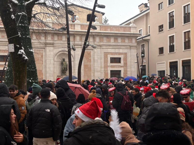 Torna l’aperitivo della vigilia all’Aquila, tradizione nata spontaneamente dopo il terremoto con la cantina del Boss che poi si è estesa a tutti i locali e che porta migliaia di persone in centro storico dal mattino sino alla sera in un clima di festa e oggi anche sotto la neve.