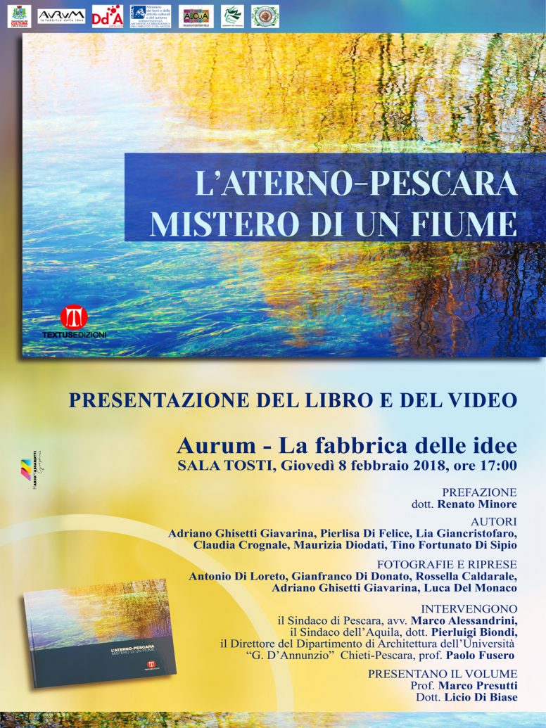 Il fiume Aterno-Pescara, il più importante fiume d’Abruzzo, nasce come Aterno dalla catena montuosa dei Monti della Laga, lambisce la città dell’Aquila, e s’inoltra, poi, nella incontaminata Valle dell’Aterno, sulle cui sponde si affacciano piccoli e preziosi centri storici ed antiche vestigia del passato, fino a giungere, a metà tragitto, a Popoli. Qui, il nascente fiume Pescara, le cui sorgenti si trovano proprio nei pressi dell’abitato, si unisce all’Aterno ed il fiume percorre, così, il suo ultimo tratto in un nuovo territorio, ricco di storia e cultura, fino ad arrivare alla città che porta il suo secondo nome: Pescara. L’abbraccio del mare conclude il suo cammino. Ora, è pronto a rinascere e ripercorrere, all’infinito, quel tragitto carico di intense emozioni, al contempo sempre uniche e sempre diverse. Raccontare per immagini il fiume è stata un’esperienza emozionante. Si è voluto sottolineare l’unicità del fiume Aterno-Pescara, anche se le caratteristiche storiche, geografiche, territoriali hanno tentato di tenere divisi i due tratti, quello aquilano e quello pescarese, avvalendosi anche del doppio nome del fiume. Si tratta di un volume fotografico con testi di autori che descrivono il territorio di influenza del fiume Aterno-Pescara dal punto di vista storico, artistico, antropologico e naturalistico. Si tratta di un volume fotografico con testi di autori che descrivono il territorio di influenza del fiume Aterno-Pescara dal punto di vista storico, artistico, antropologico e naturalistico. Il volume contiene anche un documentario video che conduce lo spettatore attraverso un percorso visivo del tutto inedito, mostrando un territorio a tratti selvaggio ed incontaminato. L’idea originaria appartiene a Tino Fortunato Di Sipio, Adriano Ghisetti ed Antonio Di Loreto, che intrapresero l’avventura della scoperta del territorio del fiume circa vent’anni fa, con escursioni fotografiche e riprese televisive, prima alla ricerca delle sorgenti dell’Aterno, ad Aringo, vicino Montereale, poi, percorrendo tutta la valle dell’Aterno e le gole di San Venanzio, fino alle sorgenti del Pescara a Popoli, per giungere, infine, all’ultima parte del percorso dove il fiume, giungendo al mare, attraversa la città di Pescara . Negli anni seguenti, si sono uniti al progetto altri autori che hanno contribuito, in maniera determinante, alla buona riuscita dell’opera: Gianfranco Di Donato, Claudia Crognale, Pierlisa Di Felice, Lia Giancristofaro, Maurizia Diodati, Rossella Caldarale, Giovanni Fato, Carmine Cappelletti, Cinzia Cordesco, Giancarlo Zappacosta, Luca Del Monaco.L’opera è stata pubblicata dalla Casa Editrice Textus ed è stata finanziata dall’Università di Architettura “Gabriele D’Annunzio” di Pescara, con il contributo della Soprintendenza Archivistica dell’Abruzzo e del Molise e di diverse associazioni culturali abruzzesi.
