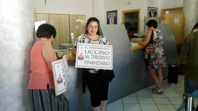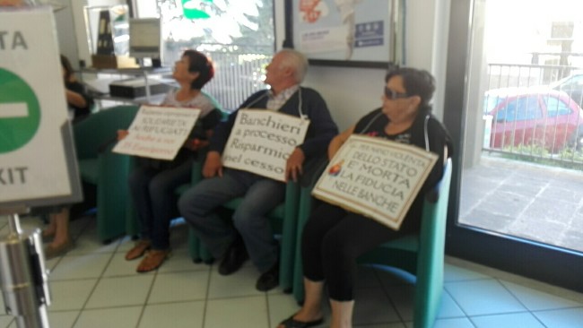 Banca Etruria: Blitz dei risparmiatori di Pizzoli questa mattina negli uffici dell’agenzia di Banca Etruria. 15 persone, con cartelli di protesta, non andranno via fin quando non saranno ricevuti dal neo presidente Nicastro.