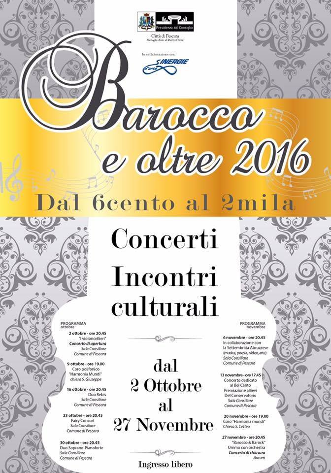 Al via dal 2 ottobre la rassegna culturale “Barocco e Oltre”, a cura dell’Associazione Culturale “Sinergie d’Arte” e con il patrocinio della Presidenza del Consiglio comunale. Un excursus dal ‘600 ai giorni nostri in musica e incontri culturali in programma fino al 27 novembre. Gli appuntamenti saranno ospitati presso la sala consiliare, le chiese di San Giuseppe e Basilica di San Cetteo e all’Aurum come hanno spiegato presentando la rassegna alla stampa il presidente del consiglio comunale Antonio Blasioli e la presidente dell’associazione organizzatrice Maria Gabriella Ciaffarini, insieme con i partner Gabriella Serafini, presidente della Settembrata Abruzzese e la band degli Ummo.