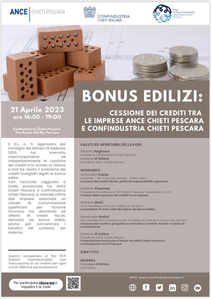 A Pescara oggi pomeriggio, alle ore 16, nella sala Orofino di Confindustria Chieti Pescara, si svolge il seminario sui Bonus Edilizi e viene sottoscritto l’accordo di cessione dei crediti tra imprese dell’ANCE e di Confindustria delle due province di Chieti e Pescara che faciliterà la cessione dei crediti fiscali, posseduti dalle imprese iscritte all’Associazione dei Costruttori, ad aziende aderenti a Confindustria.