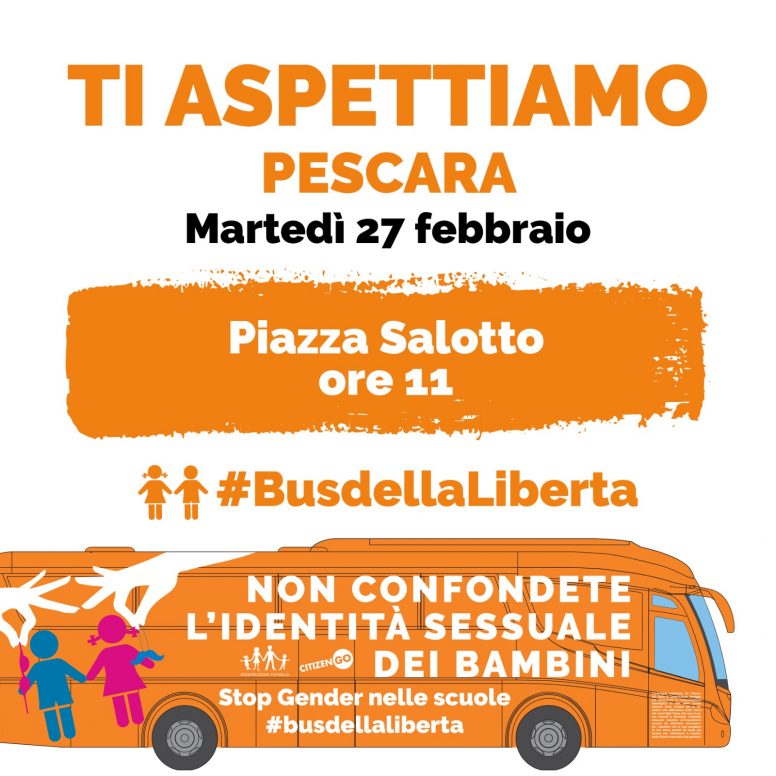 “Non confondete l’identità sessuale dei bambini” recita lo slogan della campagna ” i bambini sono maschi e le bambine sono femmine”. Molte le città italiane dove il “busdellalibertà” farà tappa nel tour iniziato due giorni fa e che si concluderà il 27 febbraio prossimo proprio a Pescara in Piazza Salotto a partire dalle 11.00. La Campagna é promossa da CitizenGO Italia & Generazione Famiglia