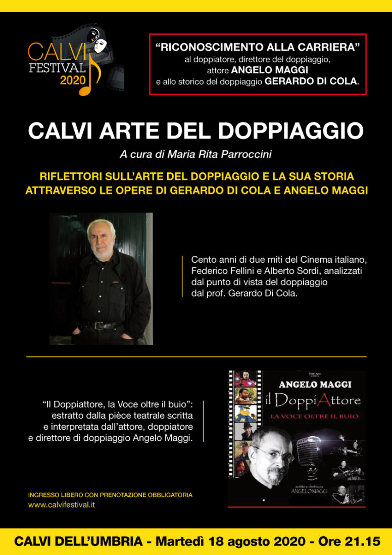 La nuova edizione del Calvi Festival, fra i suoi trentatré eventi in programma, divisi in varie categorie, propone quest’anno una nuova sezione: l’Arte del Doppiaggio. E lo farà in grande stile, domani martedì 18 agosto alle ore 21.15 con la serata dal titolo “Riflettori sull’Arte del Doppiaggio e la sua Storia” con un Omaggio alla Carriera del pescarese Gerardo Di Cola e del romano Angelo Maggi . L’evento si svlgerà nel giardino del Monastero (ingresso da Piazzetta dei Martiri). Durante la serata si tratterà dei “Cento anni dei miti del Cinema italiano, Federico Fellini e Alberto Sordi, analizzati dal punto di vista del doppiaggio dal Prof. Gerardo Di Cola; successivamente il pubblico potrà conoscere una delle più belle voci del doppiaggio italiano della quarta generazione, quella di Angelo Maggi che proporrà alcune scene tratte dal suo spettacolo di successo ‘Il DoppiAttore – La Voce oltre il buio’. La pièce teatrale è scritta, interpretata e diretta dall’attore, doppiatore e direttore di doppiaggio Angelo Maggi che a teatro ha riscosso un grande successo di pubblico e di critica. Sul palco del Calvi Festival si susseguiranno proiezioni, interviste, aneddoti e momenti di doppiaggio dal vivo. Non mancheranno delle sorprese. Infine avrà luogo il momento della consegna del riconoscimento alla carriera ai due personaggi che hanno segnato in modo indelebile, con la loro professionalità, la Storia del doppiaggio.