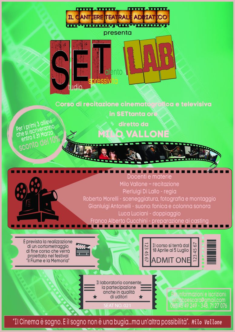 A partire dal prossimo mercoledì 18 aprile a Pescara nascerà il primo corso di recitazione cinematografica e televisiva “SET lab”, diretto da Milo Vallone e le cui docenze sono affidate a 6 apprezzati professionisti del mondo dell’audiovisivo. Considerando il proliferare delle produzioni cine-televisive sia attraverso i linguaggi tradizionali come il cinema e la televisione e sia attraverso le piattaforme di nuova generazione come quelle che offre il web, il Cantiere Teatrale Adriatico, dopo 15 anni di intensa e apprezzata offerta formativa nel campo della recitazione, ha ritenuto opportuno strutturare un vero e proprio percorso didattico, finalizzato alla conoscenza dei mezzi espressivi legati al vasto mondo dell’audiovisivo.