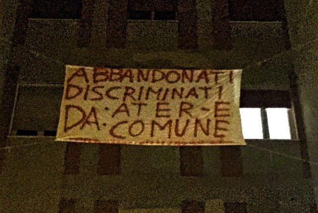 24 famiglie, nessun moroso, al civico 52 di Via Basento, condomini di una palazzina Ater che stanchi per le richieste inascoltate d’interventi urgenti, decidono di fare una colletta per dare almeno un pò di decoro ad un edificio in quasi totale abbandono. 50 euro a condomino per ritinteggiare l’androne e riparare il portone, anche se ci sono problemi molto più seri che andrebbero affrontati con interventi più decisi: tombini otturati dal 2013 e nulla hanno a che fare con l’inciviltà di qualche sparuto condomino che butta nel water assorbenti o pannolini, come era stato denunciato tempo fa dagli stessi dirigenti dell’Ater; cirda 2 metri d’acqua nelle fondamenta; infiltrazioni fino al secondo piano, per non parlare del tetto da dove penetra acqua. Già da diversi giorni, per protesta, alcuni condomini hanno affisso uno striscione con su scritto “Abbandonati, Discriminati da Ater e Comune”, e come se non bastasse, dopo i recenti fatti di Via Lago di Borgiano, ad attendere invano ci sono anche i controlli anti sismici mai effettuati.